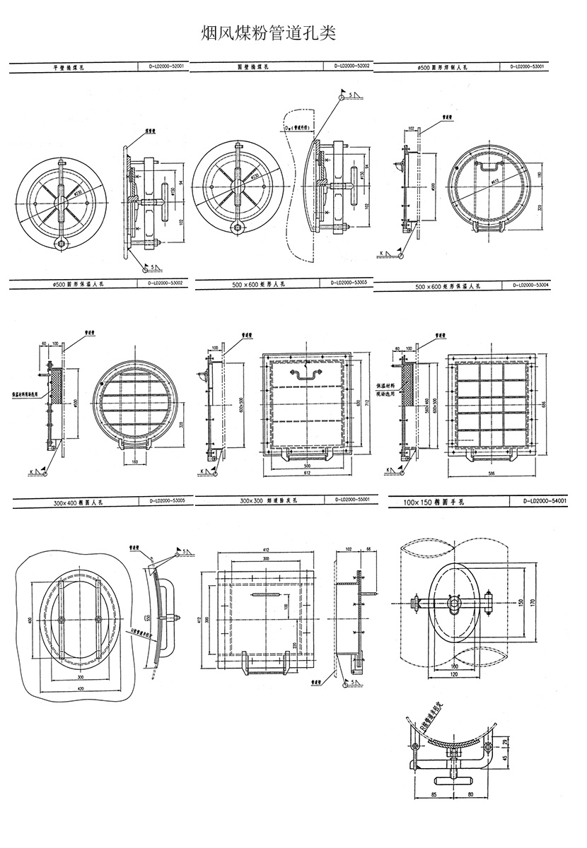 平壁捅煤孔、圓壁捅煤孔、500圓形焊制人孔、500圓形保溫人孔、500*600矩形人孔、500*600矩形保溫人孔、300*400橢圓形人孔、100*150橢圓形手孔、300*300煙道除灰孔