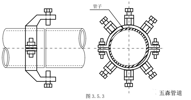 a)對于DN100以下的管子可直接進(jìn)行焊口組對,DN150以上的管子應(yīng)使用卡具組對,對接焊口可用圖3.5.3所示卡具。