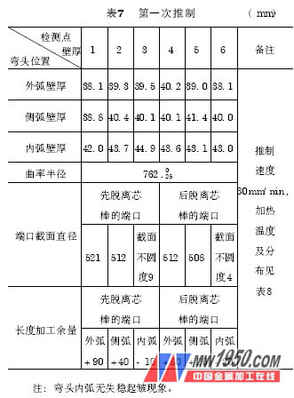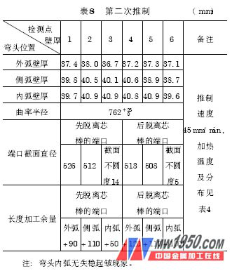( 5) 推制彎頭的檢測(cè)結(jié)果及分析 對(duì)推制彎頭用測(cè)厚儀檢測(cè)了外弧、側(cè)弧和內(nèi)弧壁厚,用平臺(tái)劃線方式檢測(cè)了曲率半徑、端口截面直徑和長(zhǎng)度加工余量。D508mm×36mm、R = 762mm、A = 50mm WB36彎頭的檢測(cè)結(jié)果如表7 、表8 所示。