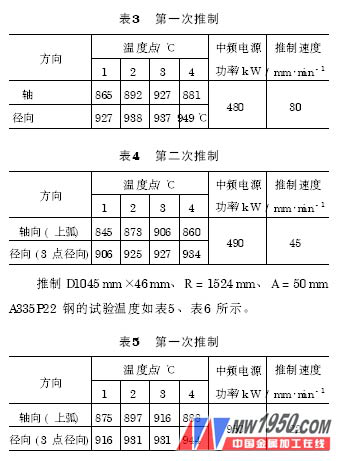 溫度分布是一個(gè)重要的工藝參數(shù),由感應(yīng)圈形狀及感應(yīng)圈與芯棒頭相對(duì)位置直接控制。感應(yīng)圈形狀是主要因素,感應(yīng)圈與芯棒頭相對(duì)位置是次要因素。溫度沿芯棒頭軸向分布規(guī)律為低、中、高、中,溫度沿芯棒頭徑向分布規(guī)律為低、中、高。加熱溫度高,推制彎頭壁厚增大。推制D508mm×36mm、R = 762mm、A = 50mmWB36 鋼的試驗(yàn)溫度如表3 、表4 所示。