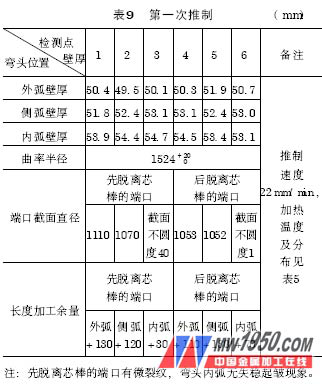 從表9 、表10 的對(duì)比中: 推制速度加快9mm/ min,曲率半徑加大84mm,即推制速度加快,曲率半徑加大。推制速度加快,加熱溫度升高,壁厚減薄5mm,即加熱溫度升高,壓縮量增大,推制速度加快,壓縮量減少。先脫離芯棒的端口,截面不圓度減少20mm,即推制速度降低,溫度升高,與模具貼合性能增強(qiáng)。