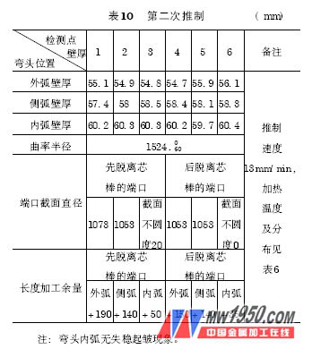 從表7 、表8 的對(duì)比中: 推制速度每分鐘加快15mm,曲率半徑加大50mm,即推制速度加快,曲率半徑加大。推制速度每分鐘加快15mm,加熱溫度降低后,壁厚減薄3mm,即加熱溫度降低,壓縮量減少,推制速度加快,壓縮量減少; 先脫離芯棒的端口截面不圓度加大5mm,即溫度降低,與模具貼合性能降低。D1045mm × 46mm、R = 1524mm、A = 50mmA335P22 彎頭檢測(cè)結(jié)果如表9 、表10 所示。