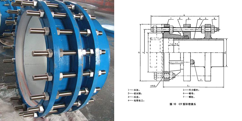 單法蘭松套傳力接頭,型號VSSJAFG(1999標準)或CF(2007標準)型,由法蘭式松套伸縮接頭和短管法蘭、傳力螺桿等構件組成。它能傳遞被連接件的壓力推力(盲板力)和補償管路安裝誤差,不能吸收軸向位移主要用于與泵、閥門等附件的松套連接。
