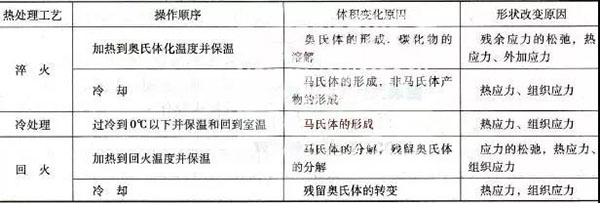 在熱處理時可能引起體積變化和形狀變化的原因見下表。表中“體積變化原因”一欄未列入鋼因熱脹冷縮現象而產生的體積變化,鋼由淬火加熱溫度到零下溫度進行冷處理,隔熱管托均隨溫度的變化而有相應的體積變化,因熱脹冷縮而引起的體積變化不均勻乃是熱應力產生的原因,而且對變形有相當的影響。