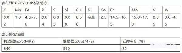 3. 焊接材料:焊絲采用ERNiCrMo-4φ2.0,其化學(xué)成分和機(jī)械性能見表2、表3,保護(hù)