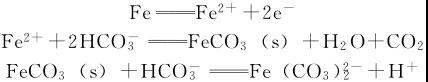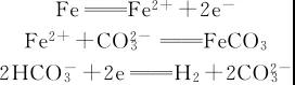 總體而言, Q345R 和 14Cr1MoR 兩種材料在單一的碳酸鹽溶液中 SCC 敏感性較低,溫度的影響不如碳酸鹽介質的影響大。 Q345R 材料在 90℃ 下 80g·L-1的 NaHCO3溶液中,表面出現許多蝕孔,隔熱管托能譜顯示成分接近鋼材本體,表面無腐蝕產物膜存在,初步認為表面發生了較為嚴重的 Fe 的溶解,在該溶液條件下發生了以下反應:
