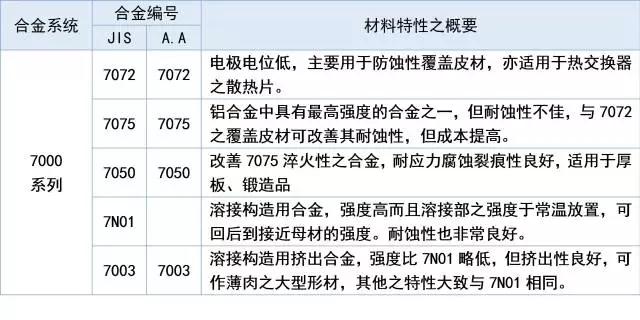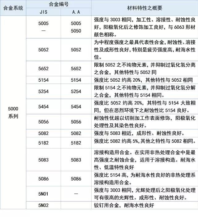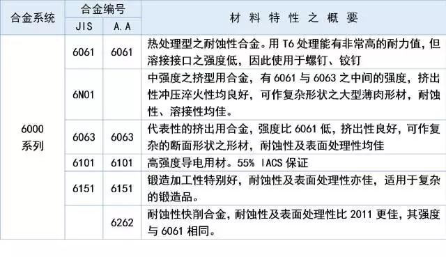 1XXX 表示為99%以上的純鋁系列,如1050、11002XXX 表示是鋁-銅合金系列,如20143XXX 表示是鋁-錳合金系列,如30034XXX 表示是鋁-硅合金系列,如40325XXX 表示是鋁-鎂合金系列,如50526XXX 表示是鋁-鎂-硅合金系列,如6061、60637XXX 表示是鋁-鋅合金系列 如70018XXX 表示是上述以外的合金體系