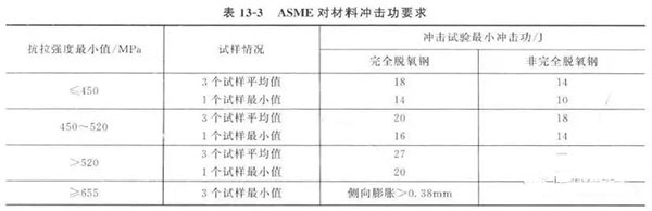 因而對高強度鋼而言,不同的鋼種應分別對指標進行校正(或附加側向膨脹量≥0.38mm) ,這種觀點在ASME 規范1977年版本已有反映。表13 - 3 所列為現行ASME VIII - 1對低溫鋼夏比(V 形缺口)沖擊試驗的最小沖擊功值。