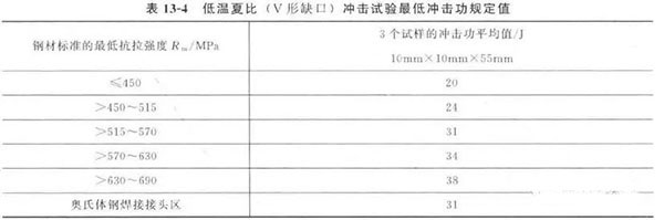 ② 鐵素體鋼側熱影響區的沖擊功應按鐵素體鋼的抗拉強度,符合表13 - 4 的要求.焊縫金屬的沖擊功也應符合表13-4 的要求。