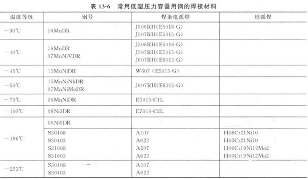 常用低溫壓力容器用鋼的焊接材料見表13 - 6 。