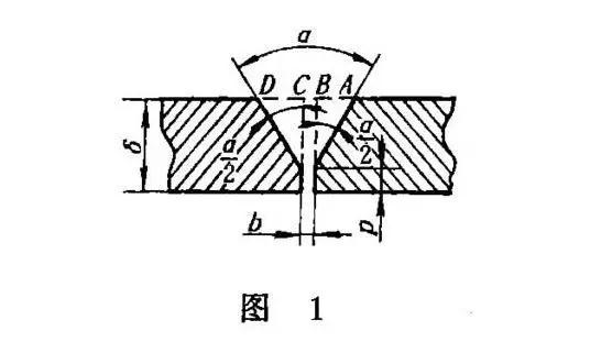 如圖1所示帶鈍邊V形坡口焊縫,坡口角度為α,間隙為b,鈍邊為P,根據(jù)解三角形的方法: