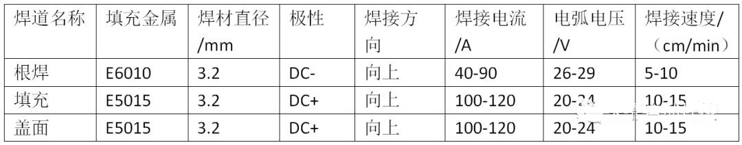 焊條電弧焊時,打底焊采用纖維素型焊條E6010,符合AWSA5.1的規定,直徑為3.2mm;填充、蓋面焊采用E5015焊條,符合GBT5117-1995的規定。藥芯焊絲半自動焊時,打底焊采用纖維素型焊條E6010,符合AWSA5.1的規定,直徑為3.2mm;填充、蓋面焊采用藥芯焊絲E71T8-Nil,符合AWSA5.29的規定,直徑為2.0mm,該焊絲具有操作性能好,焊接質量高、抗風能力強等優點。