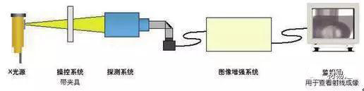 圖 2 為使用射線檢測(cè)的設(shè)備系統(tǒng)示意圖,射線經(jīng)光源激發(fā)照射到工件檢測(cè)部位,探測(cè)系統(tǒng)探測(cè)到透射線強(qiáng)度,經(jīng)圖像增強(qiáng)系統(tǒng)處理放大信號(hào)在監(jiān)視器上顯現(xiàn)。圖 3 為工業(yè)上應(yīng)用輻射顯示檢測(cè)管道內(nèi)部質(zhì)量情況的示意圖。
