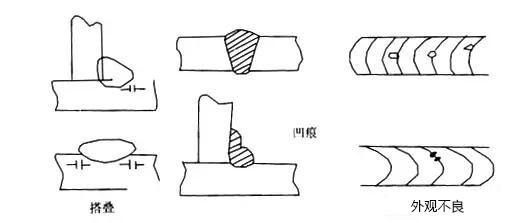 | (2)角焊時,焊條對準部位不正確。 | (2)在水平角焊時,焊絲位置應離交點1-2mm。 | |