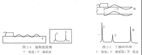 c. 瑞利波檢測(cè)    當(dāng)工件厚度大于所用波長(zhǎng)時(shí),屬瑞利波檢測(cè)。用來發(fā)現(xiàn)近于或處于工件表面并垂直工件表面的缺陷(圖2 -4 ) 。