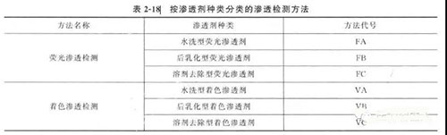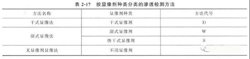 根據(jù)顯像劑和滲透劑種類不同,滲透檢測(cè)方法的分類見表2 - 17 和表2 - 18 ,各種方法組合使用的檢測(cè)步驟見表2 - 19 。