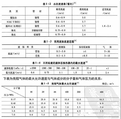 以下的三個表格分別表示了介質的流速范圍和水在管內的流速余材質的關系等。