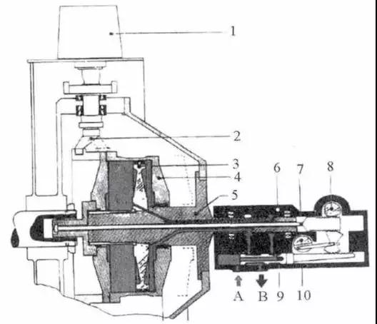 1—碟片;2—調(diào)節(jié)桿;3—活塞; 4—油缸;5—接收軸;6—控制頭;7—位置反饋桿;8—輸出軸;9—控制滑伐;10—輸入軸;