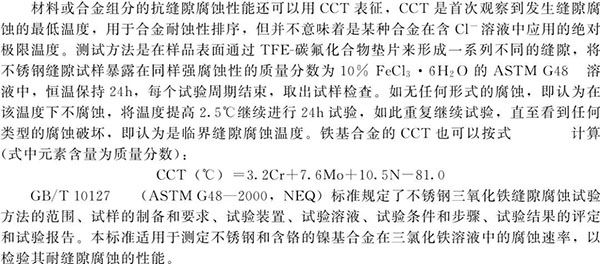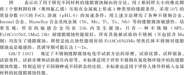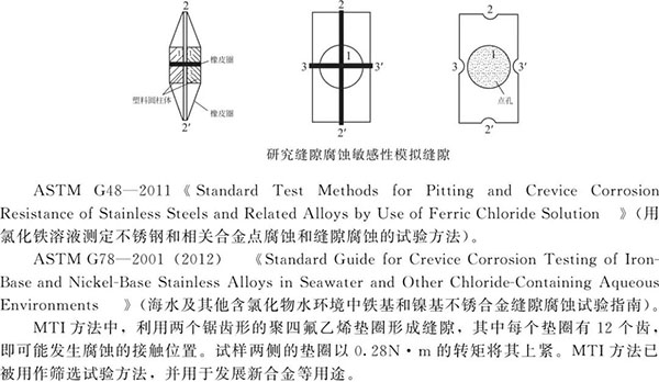 評價材料抗縫隙腐蝕性能的標準方法主要有浸泡試驗和電化學(xué)試驗。對于浸泡試驗法,設(shè)計形式多樣的人造縫隙,采用多種腐蝕介質(zhì),一般以腐蝕質(zhì)量或腐蝕深度評定試驗結(jié)果;電化學(xué)測試方法是以某些電化學(xué)參數(shù)作為判據(jù),來比較金屬材料對縫隙腐蝕的相對敏感性,一般來說,電化學(xué)測試方式可縮短縫隙腐蝕的誘導(dǎo)期而達到加速腐蝕試驗的目的。浸泡試驗法包括三氯化鐵實驗、縫隙腐蝕的加速試驗方法、多縫隙腐蝕試驗、 MTI 試驗、 CCT 法等;電化學(xué)測試方法包括 ASTM 標準試驗方法、恒電位試驗、動電位極化試驗法、遠距離縫隙裝置試驗等。