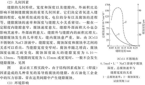 縫隙腐蝕與空穴、墊片下、搭接縫、表面沉積物以及螺母、鉚釘帽下的縫隙內(nèi)存在的少量靜止的溶液有關(guān)。環(huán)境中的腐蝕性液體可以進入到這些縫隙中,但又不能自由流動,因此,造成了這種特殊的腐蝕形式。縫隙是引起腐蝕的主要設(shè)計缺陷,也是許多壓力容器在設(shè)計中難以避免的,特別是結(jié)構(gòu)的連接處和支撐處。