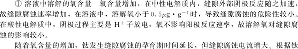 隨溫度的升高,鈦的縫隙腐蝕程度加劇,孕育期縮短。當(dāng)溫度低于 85℃ 時, Ti-Pd 合金在高濃度氯化物的實驗條件下, 120h 實驗期間未發(fā)生縫隙腐蝕。