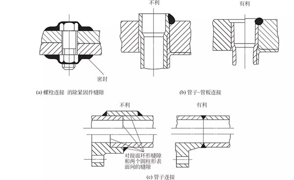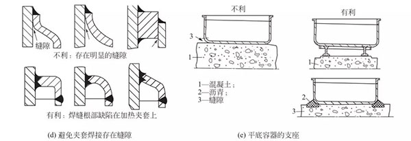 在壓力容器的設(shè)計與制造工藝上盡量不造成縫隙結(jié)構(gòu)是避免其受到縫隙腐蝕最有效的方法。盡可能避免采用金屬和非金屬的連接,設(shè)計上盡量采用滿焊結(jié)構(gòu),用焊接代替鉚接或螺栓連接;用對接焊接不用搭接;搭接焊的縫隙要用連續(xù)焊、釬焊或捻縫的方法將其封塞。焊接時,在接觸溶液的焊縫一側(cè)盡量避免孔洞、未熔合和裂紋等缺陷。應(yīng)保證容器在排空時無殘留溶液存在,設(shè)計上避免銳角和靜滯區(qū) (死角)使結(jié)構(gòu)能夠完全排流,以防生物或碎屑等在這些部位的集積,或出現(xiàn)沉淀時能及時清除;用不腐蝕的堵縫劑或用焊接來封閉已存在的縫隙;連接部件的法蘭盤墊圈采用非吸水性材料 (如在可能的條件下采用聚四氟乙烯等材料);在裝配前,接合面要刷涂料或覆蓋涂層、堆焊耐縫隙腐蝕材料。圖 4-47 為防止縫隙腐蝕可采用的幾種方法示意圖, (a)為螺栓連接,采用密封膠填充縫隙,消除緊固件縫隙;(b)管板式換熱器,管板與管束脹接段盡可能完全與管板厚度一致;( c )管子采用對接而不用插接;(d)避免夾套焊縫與筒體間產(chǎn)生縫隙;( e )容器采用支座支撐,如平底容器底部直接坐于地面,應(yīng)采取措施填充底部與地面的縫隙。