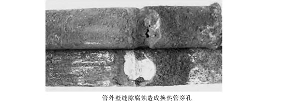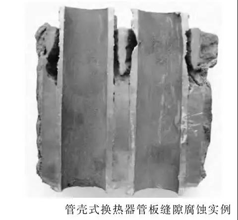 縫隙腐蝕速率一般較全面腐蝕快1 個數(shù)量級以上,常造成腐蝕部位的穿孔,是造成換熱器等壓力容器常見的失效形式之一。縫隙腐蝕將減小部件的有效幾何尺寸,降低吻合程度。縫內(nèi)腐蝕產(chǎn)物的體積增大,形成局部應(yīng)力,并使裝配困難。