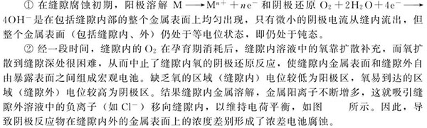 現(xiàn)在普遍為大家所接受的縫隙腐蝕機理是氧濃差電池與閉塞電池自催化效應(yīng)共同作用的結(jié)果。腐蝕開始時,縫內(nèi)、外氧濃差增加,縫內(nèi)金屬的電位變負,使縫內(nèi)陽極溶解速度增