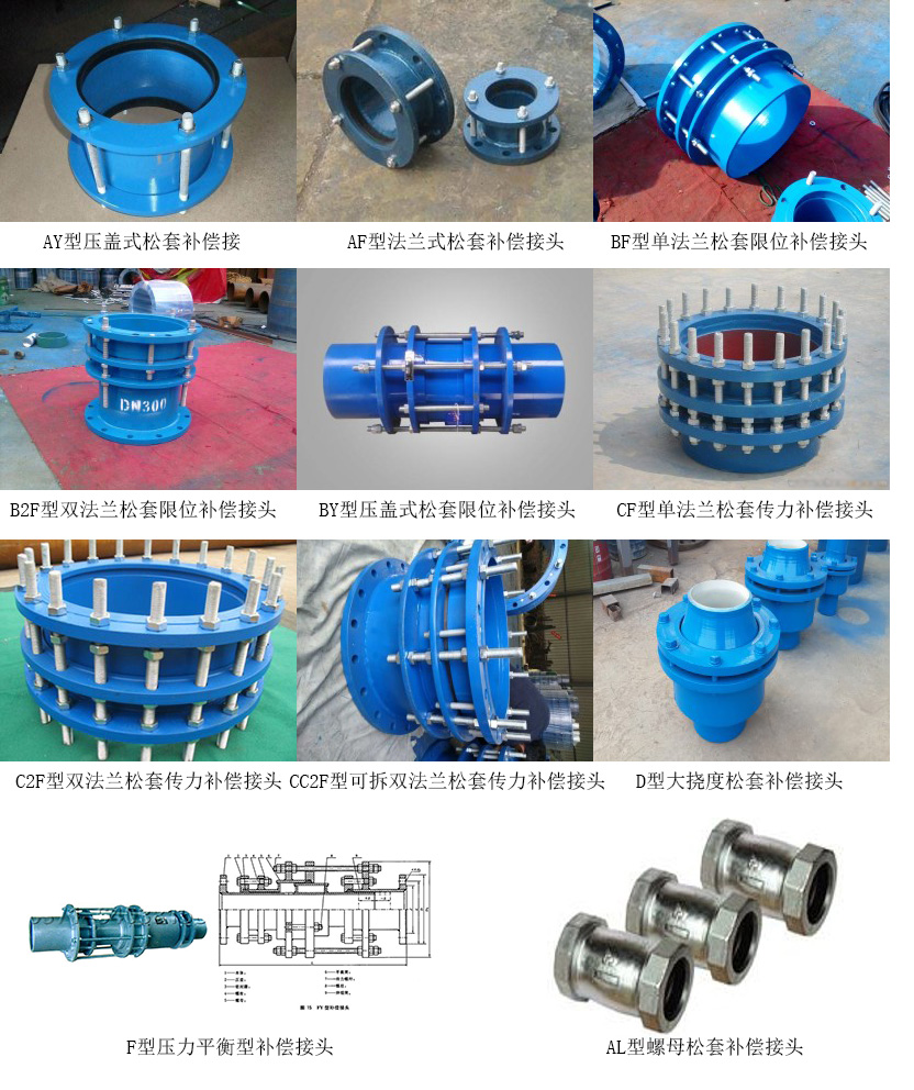Al型螺母松套補償接頭、AY型壓蓋式松套補償接頭、AF型法蘭式松套補償接頭、BF型單法蘭松套限位補償接頭、B2F型雙法蘭松套限位補償接頭、BY型壓蓋式松套限位補償接頭、CF型單法蘭松套傳力補償接頭、C2F型雙法蘭松套傳力補償接頭、CC2F型可拆雙法蘭松套傳力補償接頭、D型大撓度松套補償接頭、FY型壓蓋式壓力平衡型補償接頭、FT型填料函式壓力平衡型補償接頭