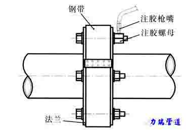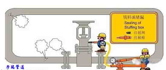 通常是采用相應的盒式卡具,把泄露部位完全包封起來,然后往密閉腔注入密封劑消除泄露,注入密封劑方法與法蘭密封法相同,還可按適用溫度、壓力、介質設計的密封環槽卡具,在槽中裝上石棉盤根,把此夾具裝在泄露部位上,再向環槽上的石棉盤根注密封劑及使盤根壓緊夾具的各連接點,而消除泄露。