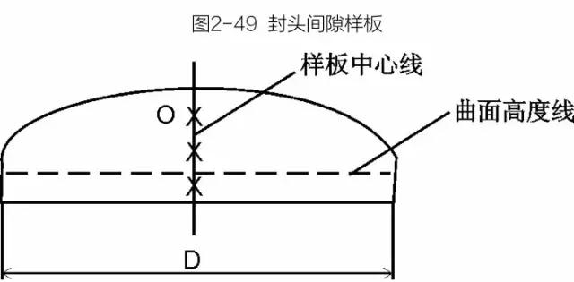 封頭間隙樣板是采用弦長相當于封頭內直徑的間隙樣板檢驗和測量封頭的內表面形狀公差,見圖2-49。