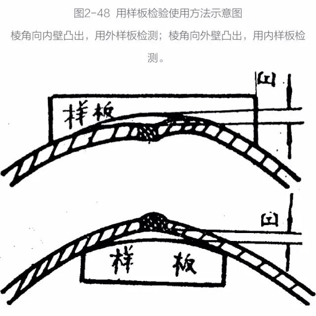 在焊接接頭環向形成的棱角E用弦長等于1/6內徑,且不小于300mm的內樣板和外樣板檢驗、測量,見圖2-47和圖2-48。